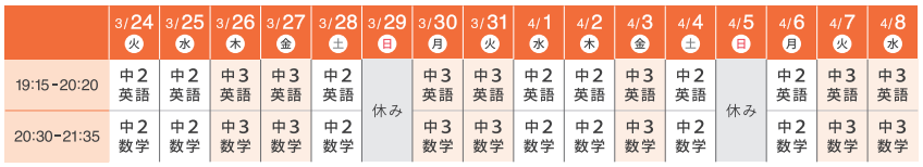 | 時間 | 19:15-20:20(英語) 20:30-21:35(数学) |