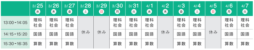 | 時間 | 13:00-14:05(理科・社会) 14:15-15:20(国語) 15:30-16:35(算数) |